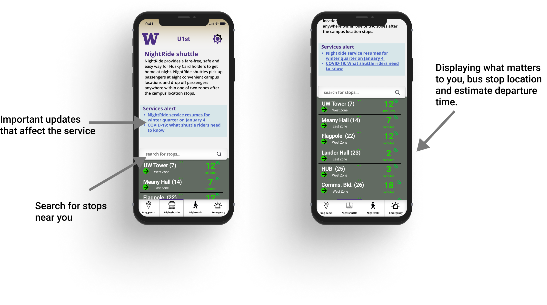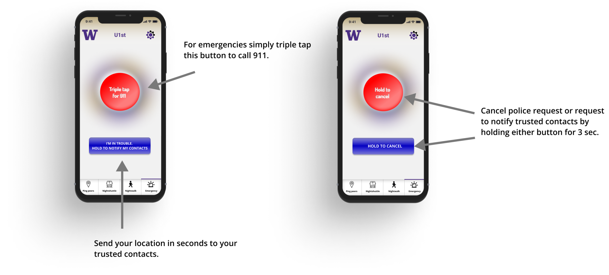 The U1st application is a personal safety application that provides resources like shuttle, escorts, and emergency safety alarms to students at the University of Washington.Students would use this app when they were being followed, attacked, or just felt uneasy.