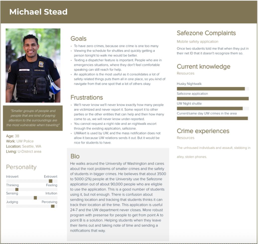 Although the University of Washington has a system called, “Husky Nightwalk,” where a campus security officer walks with a student at night so they remain safe, often students are not escort to their final destination due to distance, time restriction and the availability of the staff. The application seeks to conveniently and discreetly provide a personal safety service, to help mitigate some of these concerns.